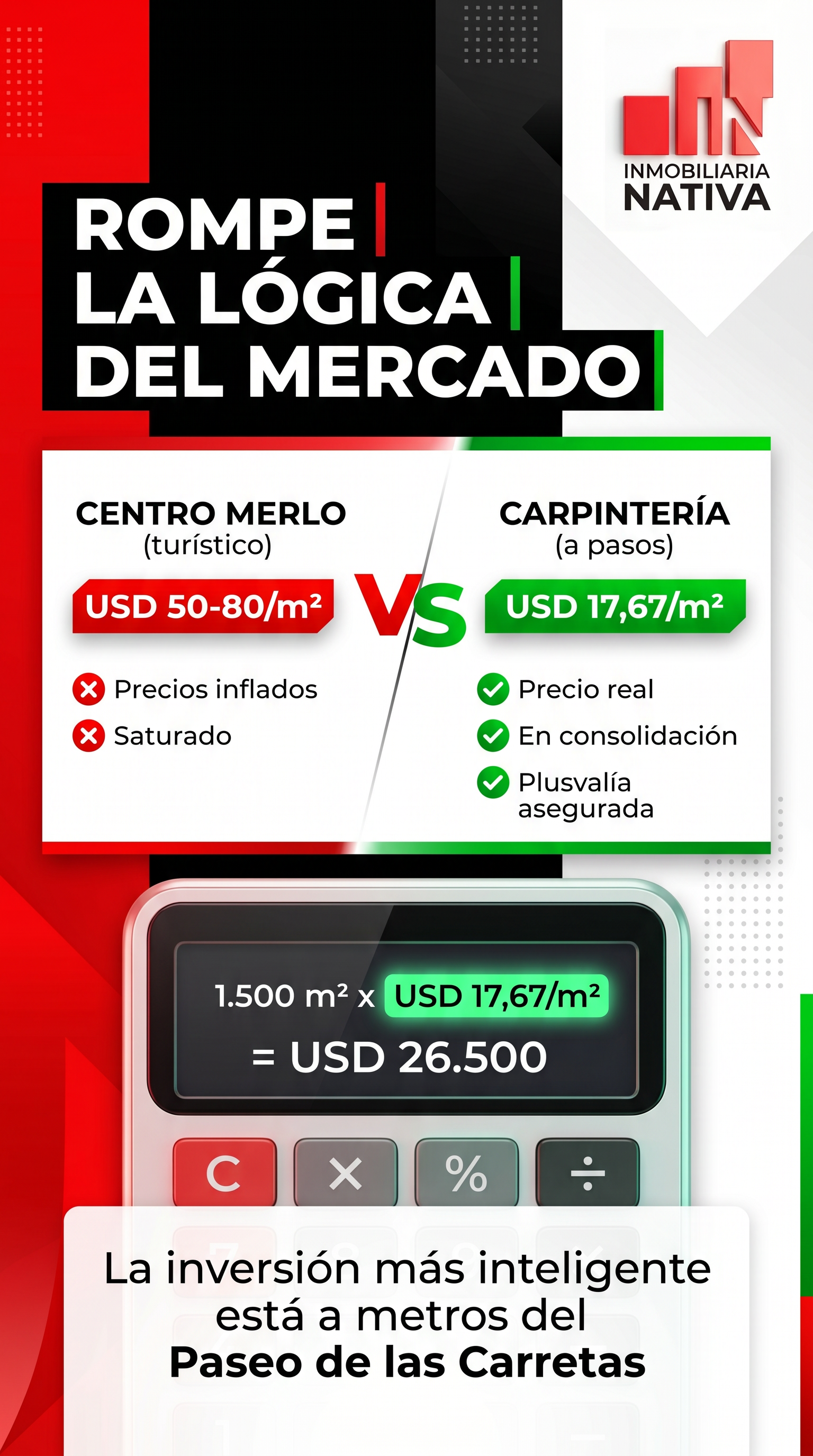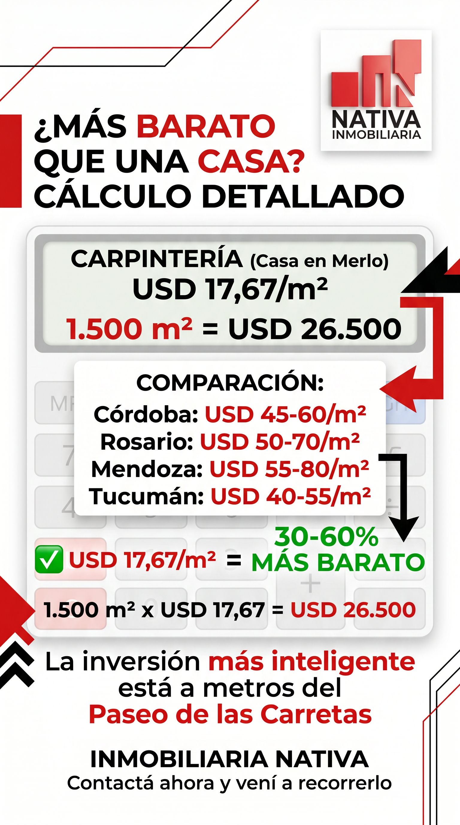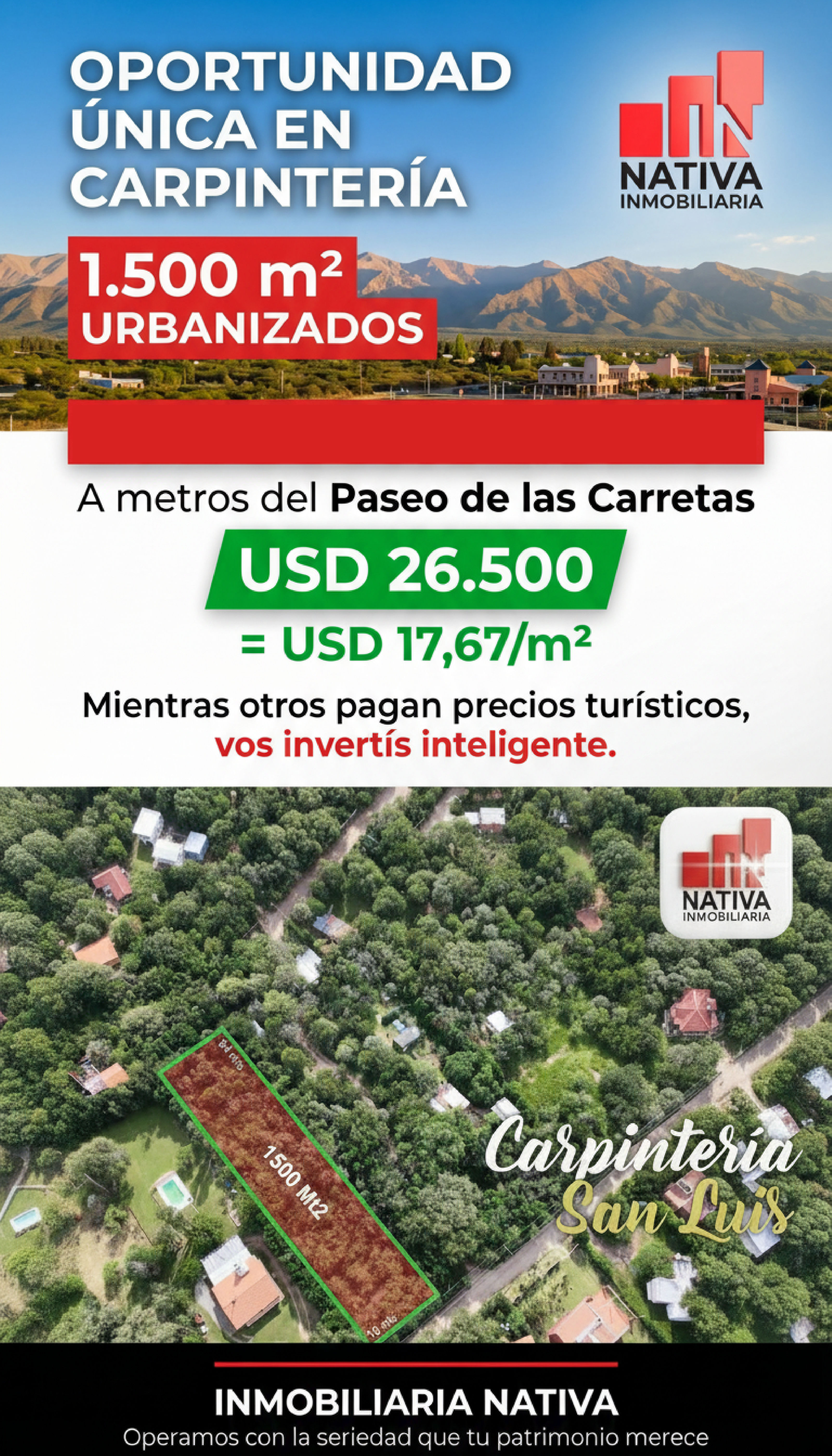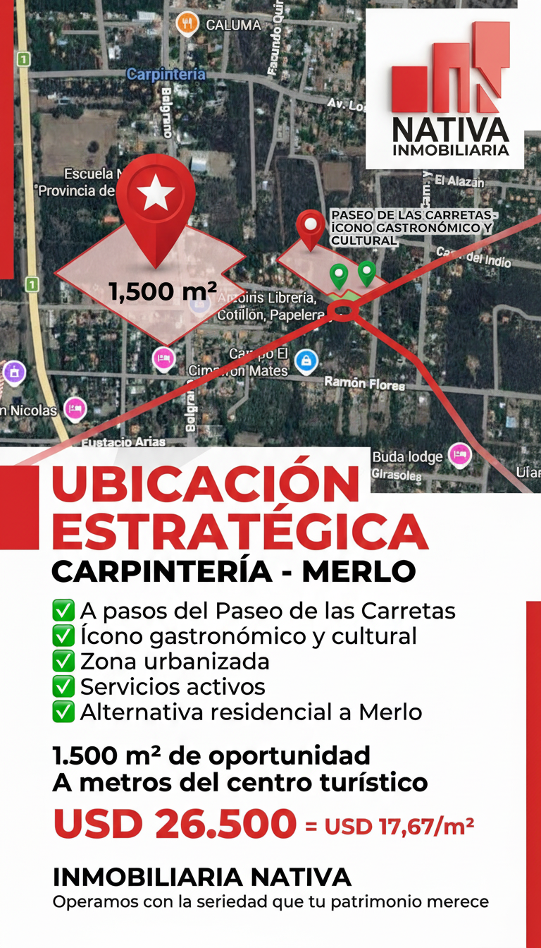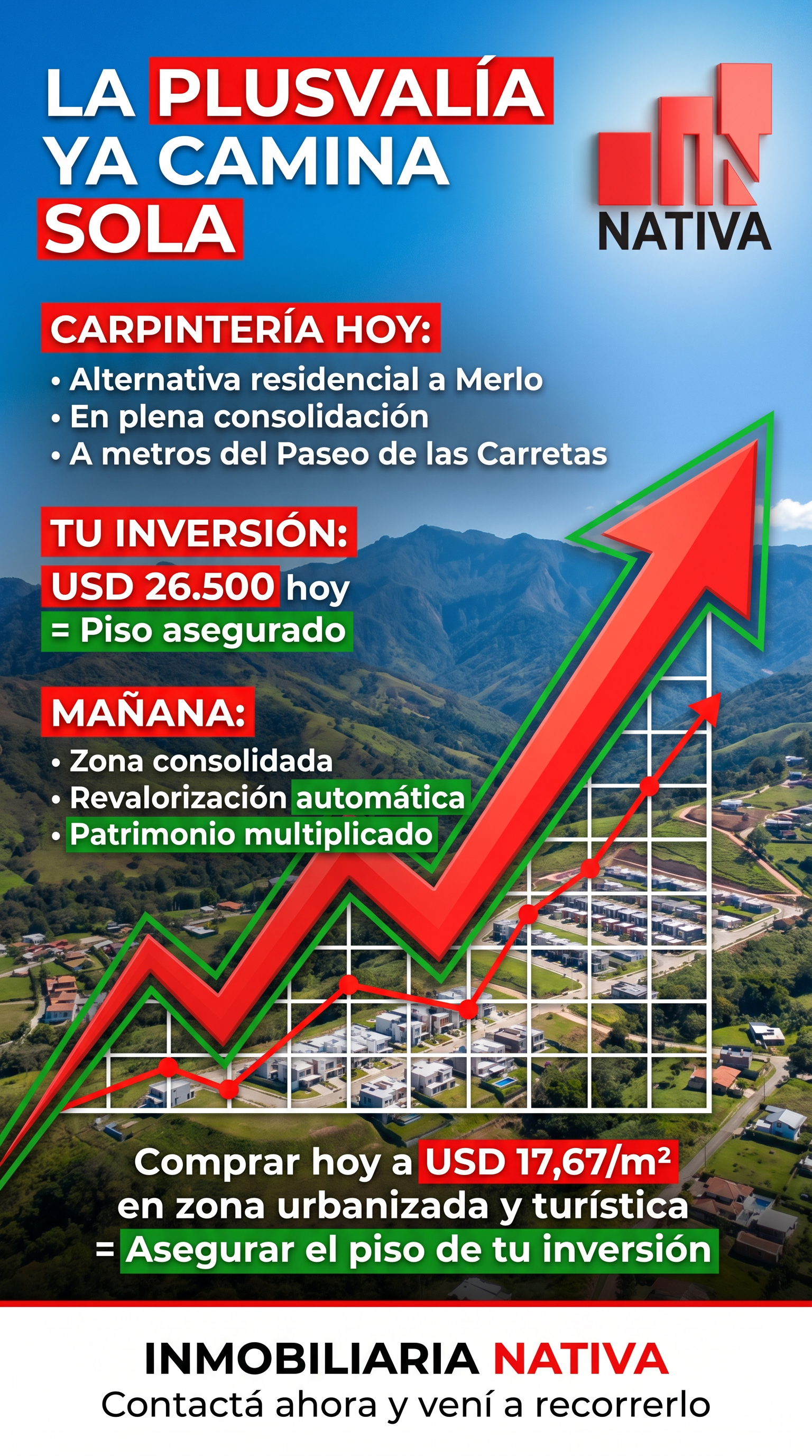 ¿Sabías que a metros del Paseo de las Carretas todavía se consigue tierra urbanizada a menos de 18 dólares el metro cuadrado? Mientras otros pagan precios turísticos en el centro de Merlo, en Carpintería —a pasos del ícono gastronómico y cultural más importante de la zona— existe un terreno de 1.500 metros cuadrados que rompe la lógica del mercado. Es grande, está en zona urbanizada, tiene servicios activos y cuesta USD 26.500. Hacé la cuenta: es más barato por metro que una casa en cualquier capital del interior. La diferencia es que acá, la plusvalía ya camina sola. ________________________________________ ???? A pocos metros del Paseo de las Carretas No es "cerca en auto". Es a pocos metros caminando del paseo comercial y turístico que concentra restaurantes, artesanos y el movimiento permanente de Carpintería. Esto significa que tu propiedad estará en una zona con demanda constante de visitantes, con calles asfaltadas y vecindario consolidado, pero sin el ruido de estar sobre la arteria principal. La tranquilidad de un barrio residencial con la comodidad de tener el centro a dos pasos. ________________________________________ ????? 1.500 metros de posibilidades concretas Este no es un terreno escondido en el monte. Es un lote en zona urbanizada, con infraestructura que ya está y que no tenés que pagar aparte: • 1.500 m² de superficie — Espacio sobrado para casa principal, jardín amplio, quincho, pileta o incluso subdivisión futura • Zona urbanizada — Calles en buen estado, acceso directo y entorno de crecimiento real, no promesas municipales • Servicios disponibles — Luz y agua ya en la zona, lo que reduce drásticamente el costo inicial de construcción • Documentación lista — Propiedad preparada para escriturar sin vueltas ni demoras administrativas • Accesibilidad total — Conexión directa con Merlo y con la ruta principal que une los valles de San Luis ________________________________________ ???? Los números que convencen Valor de la propiedad: USD 26.500 Metraje: 1.500 m² Precio por m²: Menos de USD 18 Para que entiendas la dimensión: comprar hoy a este valor en una zona urbanizada y turística es asegurar el piso de tu inversión. Cuando Carpintería complete su consolidación como alternativa residencial a Merlo —algo que ya está pasando— estos metros se revalorizan solos. ________________________________________ ???? ¿Para quién es este terreno? Para quien quiere construir sin apuros: Con 1.500 m² y servicios ya disponibles, podés diseñar en etapas: primero la casa, después el jardín, después la pileta. La zona urbanizada te da la seguridad de que tu inversión en construcción está protegida por normativa clara y entorno en crecimiento. Para el inversor que lee el mapa antes que los demás: La proximidad al Paseo de las Carretas garantiza demanda turística permanente. Construir para alquiler temporario acá es apostar a un flujo de visitantes que ya existe y crece temporada tras temporada. O simplemente retené el lote: el precio por metro cuad